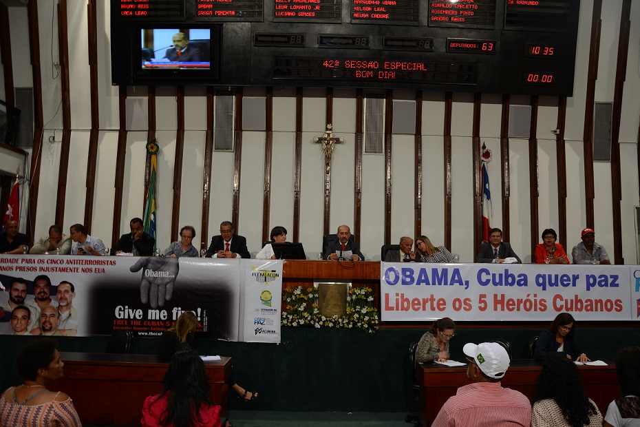 “ Obama, Cuba quer paz. Liberte os cinco heróis cubanos”, a faixa que ornamentava a Mesa de Honra da sessão resumiu o sentimento de todos que fizeram o uso da palavra. Segundo Álvaro, Gerardo Hernández, Antônio Guerrero, Ramón Labañino, Fernando González e René González são na verdade cidadãos cubanos que lutavam contra o terrorismo. Com este proposito foram viver nos Estados Unidos para obter informações sobre os planos das organizações terroristas que têm sua base de operações, há muitos anos, em Miami. Entretanto, numa manobra inconstitucional do governo dos EUA, os cinco cubanos foram presos, acusados de terrorismo, enquanto o Luís Posada Carriles, terrorista confesso dos atentados contra hotéis cubanos, tentativas de assassinato a Fidel Castro e, especialmente, a explosão de um avião da companhia Cubana de Aviação em 1976, quando morreram 73 pessoas, inclusive a equipe juvenil de esgrima de Cuba, continua vivendo livremente nos Estados Unidos da América. “Ou seja, se for para atacar Cuba, o terrorismo é aceito e incentivado pelos EUA”, questionou o deputado Álvaro Gomes.