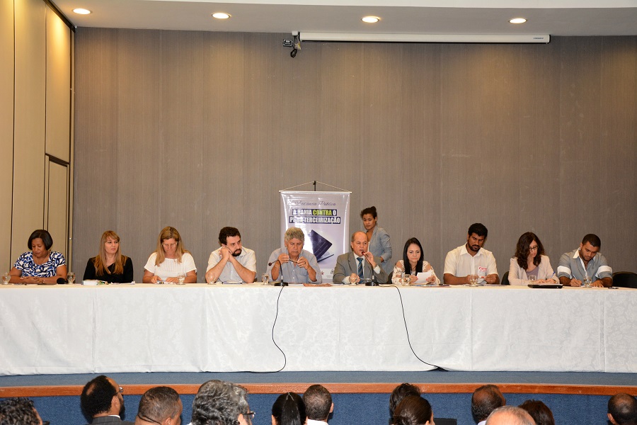 A Assembleia Legislativa da Bahia foi palco, na última sexta-feira, dia 24, de uma ampla discussão sobre as implicações do PL 4330/04, a Lei da Terceirização, aprovado esta semana pela Câmara dos Deputados. A audiência pública, convocada pelo deputado estadual Joseildo Ramos (PT) e pela deputada federal Moema Gramacho (PT), contou com a presença de diversas entidades sindicais, políticos, representantes de movimentos sociais, além de especialistas do campo do trabalho.