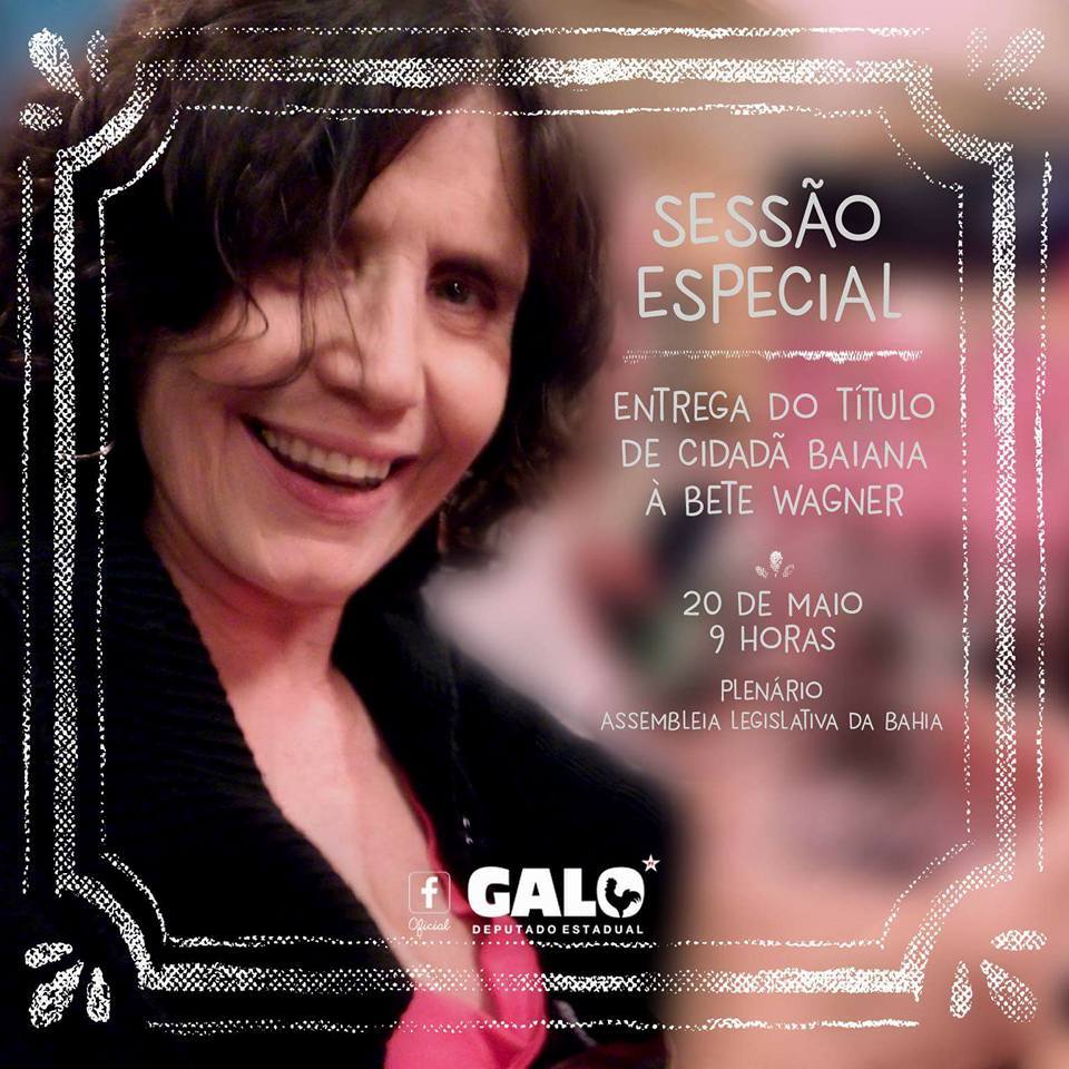 “Notável também é a sua contribuição para o desenvolvimento da cultura e das artes na Bahia, onde, com sua militância, defende os interesses da dança, da música e de outras linguagens culturais. Apaixonada pela dança, Beth Wagner organiza há três anos seguidos a ‘Semana da Dança’, na Assembleia Legislativa, oportunidade em que grupos de dança de toda a Bahia se apresentam na Casa Legislativa, fortalecendo o debate sobre investimentos e políticas públicas no parlamento para a cultura baiana”, afirma Galo. Entre as autoridades que devem participar da atividade de entregar do título de cidadã baiana a Bete Wagner estão os ministros Jaques Wagner e Juca Ferreira.