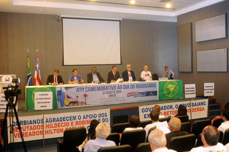 Na data em que é comemorado o Dia dos Rodoviários da Bahia, funcionários do extinto Departamento de Infraestrutura de Transportes da Bahia (Derba), participaram, no auditório do jornalista Jorge Calmon da Assembleia Legislativa, de audiência pública, presidida pelo deputado estadual Hildécio Meireles (PMDB). “Espero que o governo do Estado reveja o posicionamento de extinção de órgão tão importante para o desenvolvimento econômico da Bahia e que o mesmo seja restabelecido”, afirmou o deputado.