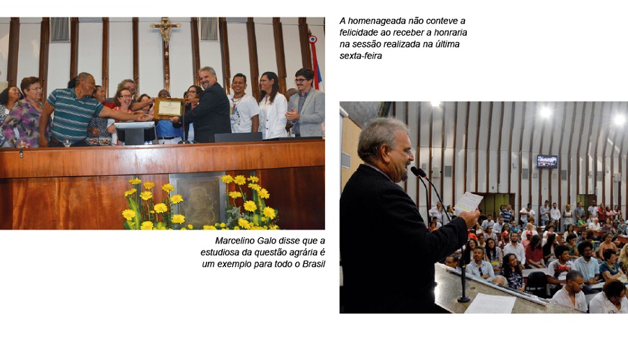 Logo no início, a emoção tomou conta do plenário quando o petista Marcelino Galo designou a ex-secretária de promoção da igualdade racial, Vera Lúcia Barbosa, e membros de movimentos sociais para recepcionar a homenageada. A comitiva foi recebida no recinto de pé e por um aplauso entusiasmado dos colegas da universidade, estudantes, de trabalhadores e trabalhadoras do movimento sem terra e de tantos outros movimentos que se fizeram presente no evento. Do discurso de Galo veio a explicação para a emoção: esta é uma homenagem a uma pessoa cuja história é um testemunho de luta, de opção pela classe trabalhadora, de aposta no saber como ferramenta de emancipação.