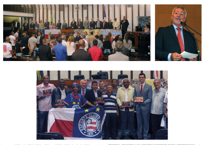 Durante a tarde de ontem vários foram os pronunciamentos. Falaram o atual presidente do Bahia, Marcelo Sant’Ana, e o conselheiro TCE Paulo Maracajá, presidente do Bahia na ocasião da conquista. Outro tricolor de coração, o secretário de Infraestrutura e Recursos Hídricos, Cássio Peixoto. Todos foram condecorados com placas honoríficas, totalizando 21 homenagens, incluindo ausentes, como o ex-zagueiro João Marcelo, representado pela cunhada, a desembargadora Maria de Lourdes Medauar; Gil Sergipano (recebeu a filha Mariana) e o médico Marcos Lopes, que sugeriu a instituição da torcida como patrimônio cultural e imaterial.