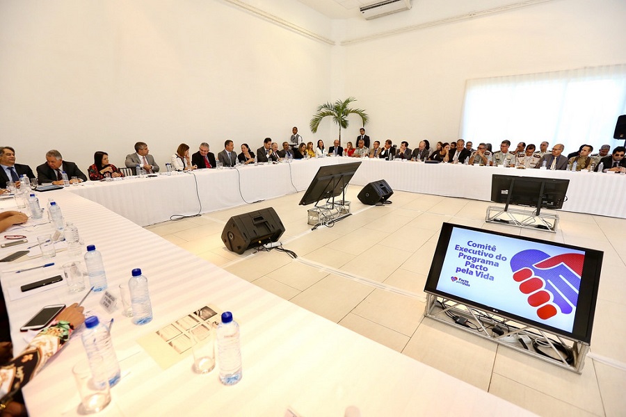 O encontro regional do Pacto pela Vida chegou à Região Metropolitana de Salvador (RMS) nesta segunda-feira, dia 5. O presidente da Assembleia Legislativa da Bahia (ALBA), Angelo Coronel, ao lado do governador Rui Costa; da presidente do Judiciário, desembargadora Maria do Socorro, da chefe do Ministério Público, Ediene Lousado; do defensor-geral, Clériston Macedo, e da prefeita de Lauro de Freitas, Moema Gramacho, participou da sexta reunião do Comitê Executivo do programa estadual, realizada na Casa de Eventos Cosme e Damião, no bairro do Caji, em Lauro de Freitas.