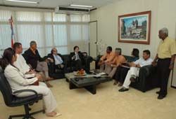 Representantes do Movimento Baiano Interdistrital de Emancipações foram recebidos ontem pelo presidente da Assembléia Legislativa, Clóvis Ferraz (PFL), no gabinete da presidência. Segundo o presidente da entidade, Alibert Araújo, o objetivo do encontro foi solicitar ao presidente o Plenarinho da Casa, no próximo dia 7 de junho, para audiência pública no âmbito da Comissão de Divisão Territorial. Ele estava com os deputados Emério Resedá (PFL) e Zé das Virgens (PT), presidente e vice do colegiado da AL.