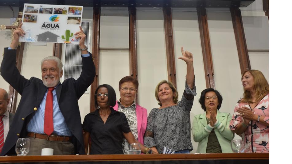 Os secretários da Ciência e Tecnologia, Vivaldo Mendonça, de Meio Ambiente, Geraldo Reis, e de Desenvolvimento Econômico, Jaques Wagner, também prestigiaram o evento. O ex-governador recebeu uma placa honorífica em reconhecimento por ter implementado o programa na Bahia. A proponente da sessão aproveitou para elogiar o ex-governador. “Como filha daquele sertão, digo o quanto foi bom tê-lo governando a nossa Bahia. O senhor tirou a lata d’água da cabeça das mulheres”, enalteceu. Ela disse que a disseminação de cisternas, poços artesiano e sistemas de abastecimento de água mudou a vida de quem perdia horas indo encher baldes e evitou as doenças ocasionadas pelo peso transportado.