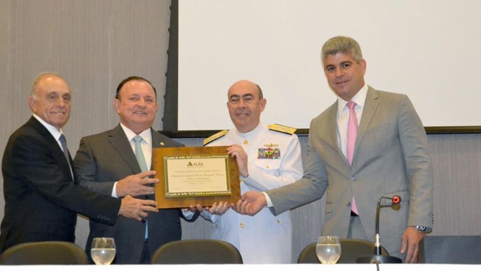 O almirante de esquadra Cláudio Portugal de Viveiros, chefe de assuntos estratégicos do Estado-Maior Conjunto das Forças Armadas, recebeu ontem (29) o Título de Cidadão Baiano da Assembleia Legislativa da Bahia (ALBA). A sessão especial, proposta pelo deputado Adolfo Menezes (PSD), aconteceu no Auditório Jornalista Jorge Calmon.