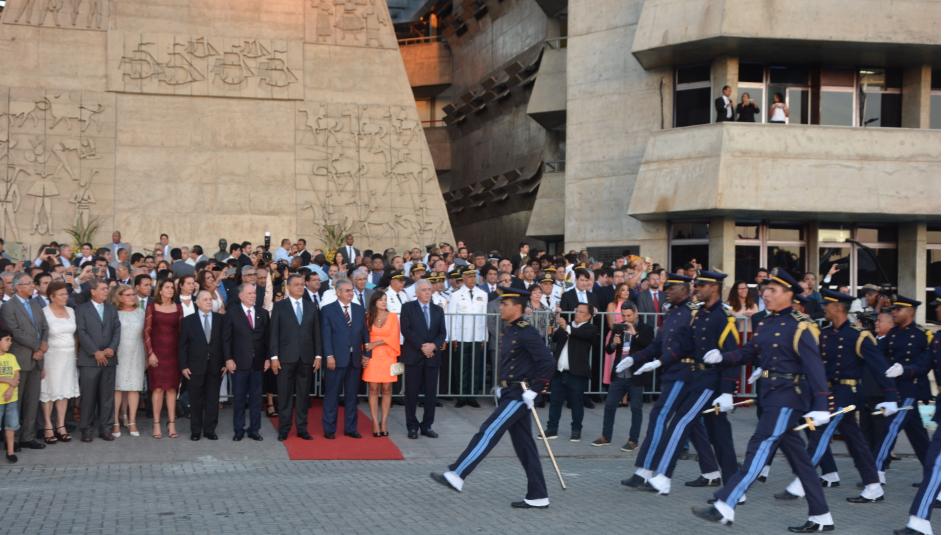 A cerimônia externa de posse do governador prosseguiu com os cadetes e integrantes da banda militar desfilando em saudação ao presidente Angelo Coronel.