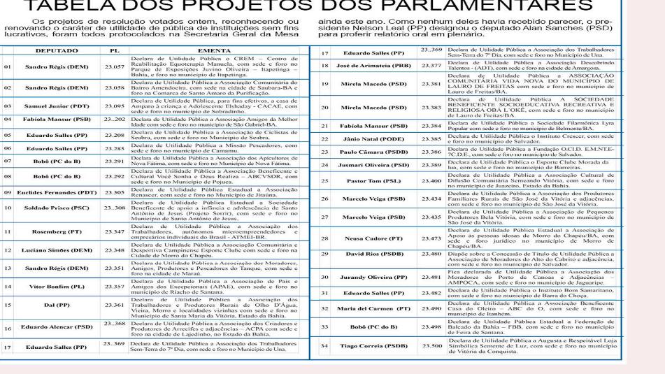 Alex da Piatã (PSD) contou com o parecer favorável de Pedro Tavares (DEM) para ver seu PL 21.074/15 acolhido por todos no plenário. O pessedista propôs a instituição do Programa Fila Zero nos hospitais públicos ou conveniados ao SUS para exames de Ressonância e tratamentos de quimioterapia e radioterapia. O PL 23.433/19, de Antonio Henrique Junior (PP), foi bastante elogiado por Fabíola, que definiu como de extrema relevância, em seu parecer, ao incluir o defensor público entre as autoridades que podem atestar o funcionamento continuo de entidades civis de direito privado durante o tempo necessário para o reconhecimento da utilidade pública.