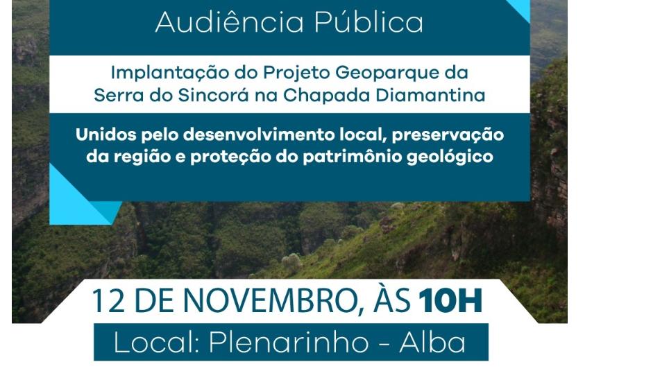 Com o objetivo de contribuir com o desenvolvimento sustentável da Chapada Diamantina, a preservação da região e a proteção do patrimônio geológico e cultural, a deputada Ivana Bastos promoverá uma audiência pública para discutir sobre a implantação do projeto Geoparque Serra do Sincorá. O encontro acontecerá no dia 12 de novembro, às 10h, no Plenarinho da Assembleia Legislativa da Bahia (ALBA).