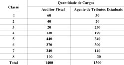 Com o objetivo de racionalizar a possibilidade de promoção nas carreiras de Auditor Fiscal e Agente de Tributos Tributários, o governador Jaques Wagner enviou para apreciação da Assembléia Legislativa projeto de lei que estabelece a quantidade de cargos por classe das carreiras do Grupo Ocupacional Fisco (veja tabela nesta página). Segundo o diretor geral da Secretaria da Fazenda, Moyses Andrade, o rateio de vagas é feito anualmente e a tabela apresentada no decreto é referente ao número previsto para o ano de 2007.