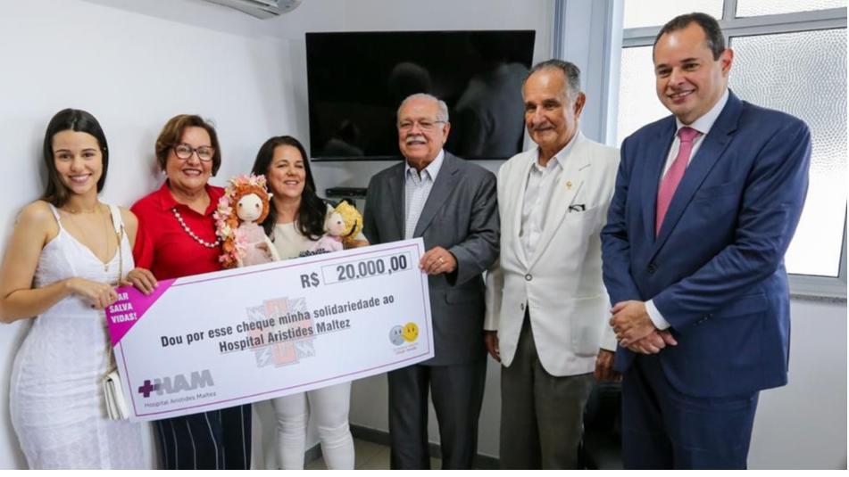 Em solenidade realizada nesta segunda-feira (17) no Hospital Aristides Maltez, o presidente da Assembleia Legislativa da Bahia, Nelson Leal, entregou ao presidente da Liga Bahiana Contra o Câncer, o ex-governador César Borges, e ao médico Aristides Maltez Filho, um cheque no valor de R$ 20 mil, resultado da ação comandada pela Assembleia de Carinho, através de sua esposa Danda Leal. O dinheiro foi obtido a partir da revenda de 100 bonecas de pano, confeccionadas diretamente por ela, através do seu Atelier Liukalu. A doação será usada na manutenção do hospital, que é referência nacional no tratamento do câncer e atende diariamente a cerca de 3.500 pacientes do SUS, oriundos de 394 municípios baianos e, também, de outros 13 estados brasileiros. O chefe do Legislativo baiano estava acompanhado de sua esposa, Danda, de sua mãe, Lia, e de uma de suas três filhas, Maria Luísa.