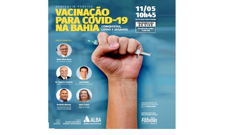 A Comissão de Educação, Cultura, Ciência e Tecnologia e Serviços Públicos da Assembleia Legislativa, presidida por Fabíola Mansur (PSB), realiza audiência pública virtual "Vacinação para Covid-19 na Bahia: Conquistas, Lutas e Desafios". A audiência acontece terça-feira (11), às 10h45, conjuntamente com a Comissão de Saúde e Saneamento da ALBA, e contará com as participações do secretário estadual de Saúde, Fábio Vilas-Boas; do secretário de Saúde de Salvador, Leo Prates; do diretor executivo da UPB, prefeito Marcão; da presidente do Conselho Estadual dos Secretários Municipais de Saúde da Bahia (COSEMS/Ba), Stela Souza; e do promotor de Justiça, Dr. Rogério Queiroz. A transmissão ao vivo poderá ser acompanhada através dos canais oficiais da TV ALBA.