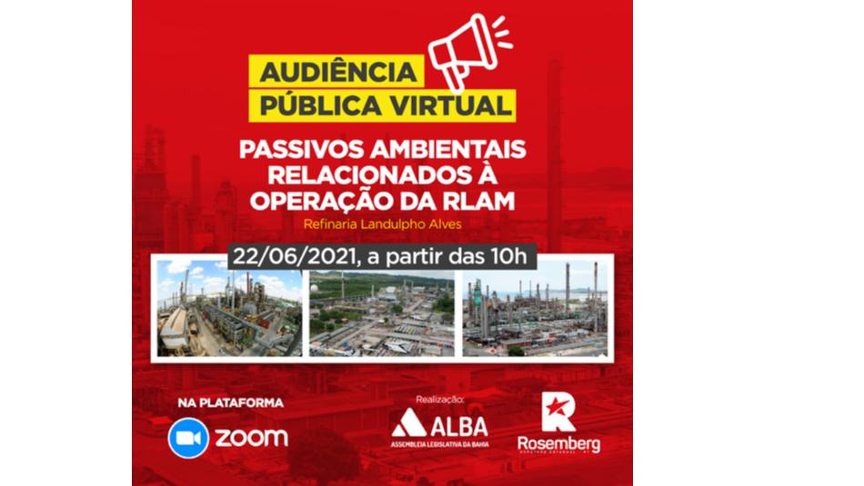 A Assembleia Legislativa promove, nesta terça-feira (22), uma audiência pública para discutir os passivos ambientais relacionados à venda da Refinaria Landulpho Alves (Rlam), localizada em São Francisco do Conde, no Recôncavo baiano. Passivos ambientais são os danos causados ao meio ambiente, representados pelas obrigações e responsabilidades sociais das empresas com os aspectos ambientais de suas atividades.