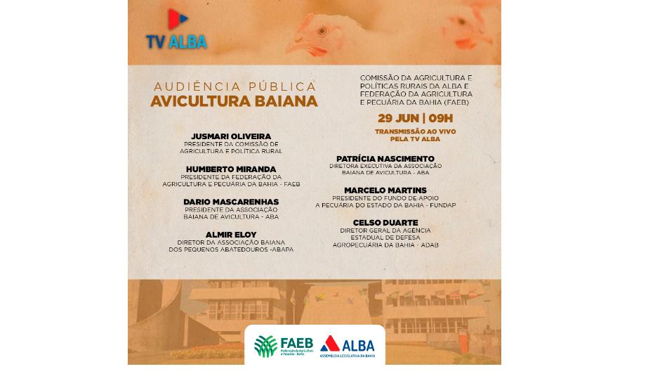 A Comissão de Agricultura e Politica Rual da Assembleia Legislativa, presidida pela deputada Jusmari Oliveira (PSD), e a Federação da Agricultura e Pecuária da Bahia (Faeb) realizam nesta terça-feira (29), às 9h, uma audiência pública como o objetivo de discutir a situação da avicultura na Bahia.
