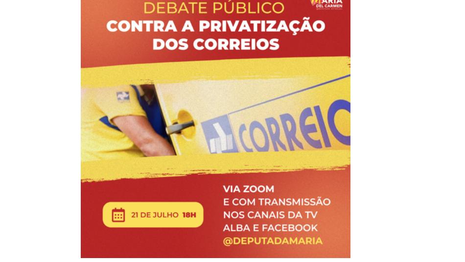 A deputada Maria del Carmen (PT) e a bancada do Partido dos Trabalhadores da Assembleia Legislativa da Bahia (ALBA) promovem, nesta quarta-feira (21), às 18h, na plataforma Zoom, um debate público sobre o “Projeto de Lei Federal nº 591/2021 que propõe a privatização dos serviços postais prestados pela Empresa Brasileira de Correios e Telégrafos (EBCT)”. O evento também será transmitido pela TV ALBA (@tvalba), no canal aberto 12.2 e NET 16.