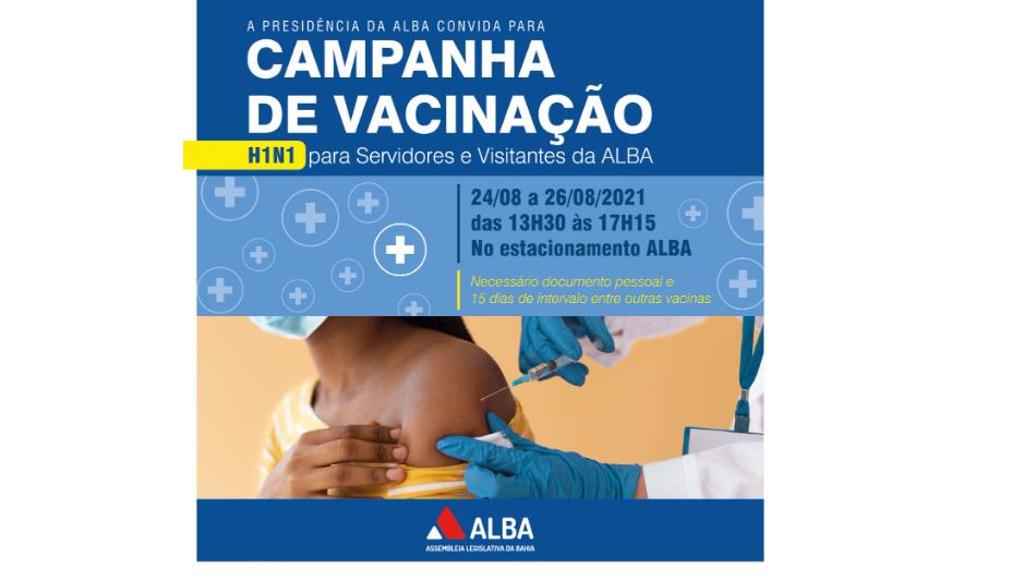 A Assembleia Legislativa da Bahia (ALBA) vai promover entre os dias 24 e 26 de agosto, uma campanha de vacinação contra a gripe H1N1. Mesmo tendo como foco os servidores da Casa, a campanha será aberta ao público em geral e é fruto de uma parceria da Presidência da ALBA com a Secretaria Municipal de Saúde de Salvador. Para se vacinar, só é necessário levar algum documento pessoal, como a carteira de identidade.