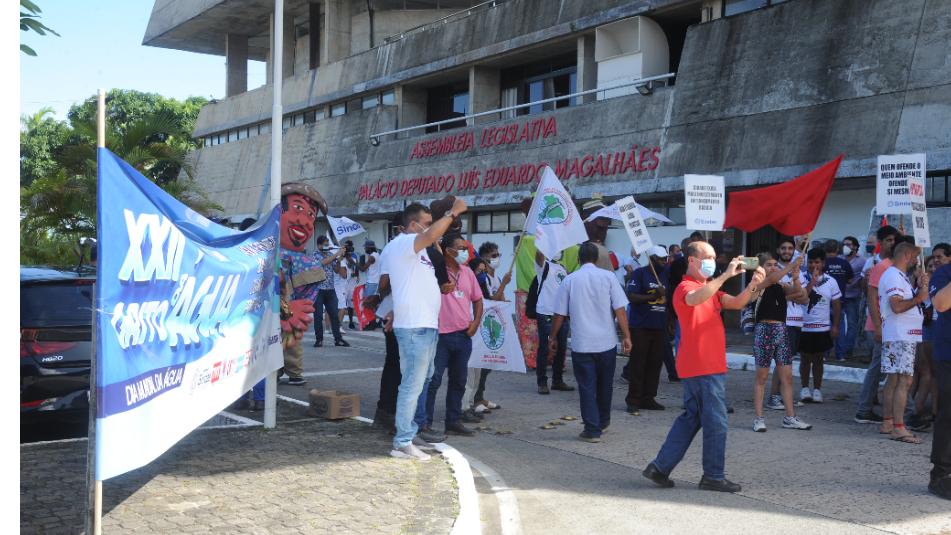 Cerca de 100 manifestantes protestaram contra os projetos do Poder Executivo que sugere adequação da legislação estadual e da estrutura da Embasa ao novo marco regulatório legal do saneamento – facilitando concessões nessa área vital. O protesto começou a partir das 14h desta terça-feira (22), Dia da Água, em frente à portaria da Assembleia Legislativa.