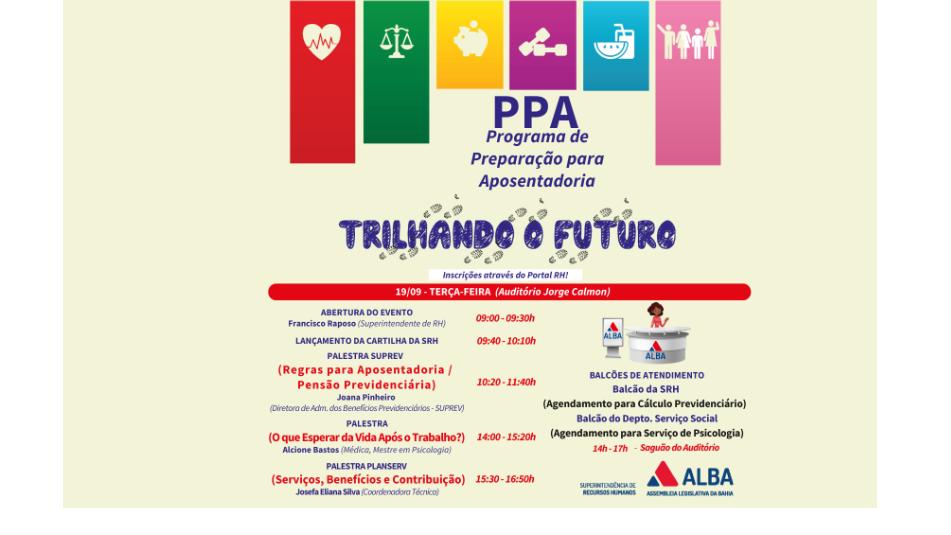A Superintendência de Recursos Humanos da Assembleia Legislativa da Bahia (ALBA) realizará, através da Escola do Legislativo, da Diretoria de Promoção à Saúde e do Departamento de Administração de Pessoal, o programa de preparação para a aposentadoria. O evento, que começará no próximo dia 19, a partir das 9h, no Auditório Jornalista Jorge Calmon, terá palestras e rodas de conversa também nos dias 26, 27 e 28 deste mês de setembro.