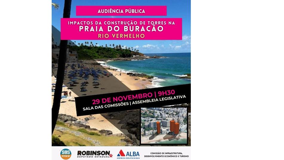 A Comissão de Infraestrutura da Assembleia Legislativa da Bahia realiza, nesta quarta-feira (29), às 9h30, na Sala das Comissões, uma audiência pública para discutir os impactos da construção de três torres na Praia do Buracão, no bairro do Rio Vermelho. O debate é proposto pelo deputado Robinson Almeida (PT).