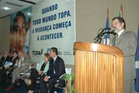 Em seu pronunciamento, Nilo elogiou o estilo político do governador, que fez questão de convidar todos os prefeitos para o evento e não discrimina entre os que são aliados e adversários. "Nós temos o dever de trabalhar para todos", disse, fazendo um apelo a todos, mandatários municipais, deputados e sociedade civil organizada, a apoiarem o Topa, que tem a meta de alfabetizar 1 milhão de pessoas até 2010. Ele lembrou que o programa foi lançado no ano passado, em Coronel João Sá, que tem um dos piores índices de analfabetismo da Bahia, que, por sua vez, tem os piores índices do país.