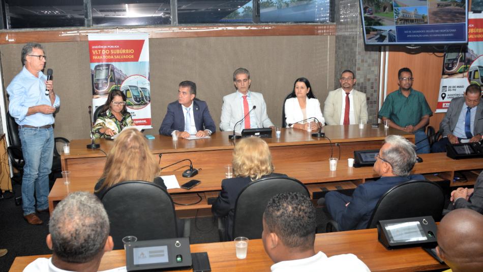 A obra do VLT (Veículo Leve sobre Trilhos) do Subúrbio de Salvador foi tema da audiência pública realizada pela Comissão de Infraestrutura, Desenvolvimento Econômico e Turismo na manhã desta terça-feira (20), na Assembleia Legislativa da Bahia (ALBA). Coube ao deputado Robinson Almeida (PT), proponente da sessão, a liderança dos trabalhos, que contou com a presença da secretária estadual de Desenvolvimento Urbano, Jusmari Oliveira, da presidente da Companhia de Transportes da Bahia (CTB), Ana Cláudia Nascimento, e do diretor de obras da CTB, Eracy Maciel, que fez uma exposição sobre o projeto. Também compuseram a Mesa o ex-vereador Tiago Ferreira e lideranças do Subúrbio Ferroviário.
