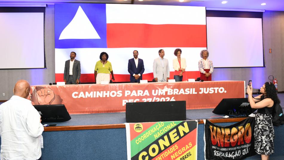 A mesa de abertura do seminário foi composta pelos membros da Comissão Especial da PEC 27-2024, os deputados federais Márcio Marinho (Republicanos), 1° vice-presidente do colegiado; a presidente Benedita da Silva (PT), o relator da matéria Orlando Silva (PC do B); o 3º vice-presidente, Josivaldo JP (PSD); e Talíria Petrone (Psol). Como expositoras, participaram a deputada estadual Olívia Santana (PC do B); e a secretária municipal de Reparação Racial, Isaura Genoveva Neta, e a vereadora Ireuda Silva (Republicanos), ambas de Salvador.