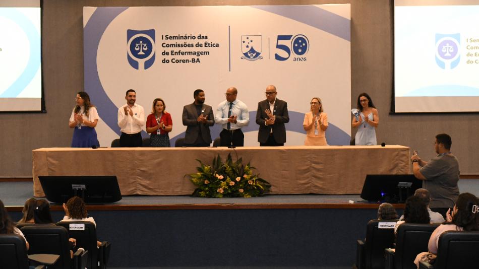 Compuseram a mesa o presidente do Conselho Regional de Enfermagem da Bahia, Dr. Davi Apóstolo; o vice-presidente, Dr. Júlio César; o representante do Conselho Federal de Enfermagem, Dr. James Francisco; a primeira tesoureira do Coren-BA, Dra. Emídia Oliveira; a coordenadora da 2ª Câmara Técnica de Ética, conselheira Karine Batista Leal; e a chefe do Departamento Ético do Coren-BA, Dra. Rosimeire Cardoso.
