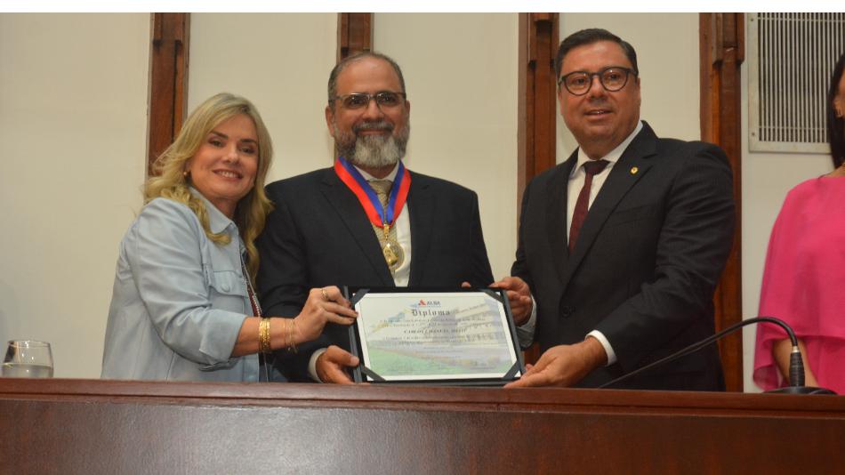 O homenageado adentrou o plenário Orlando Spínola acompanhado de familiares – sua mãe Jane, esposa Alice, sua filha Maria Emília e genro Paulo, a neta Helena e o tio, ex-deputado Antonio Fernando – além do deputado Antonio Henrique Júnior (PP), sob forte aplauso do plenário e da galeria Paulo Jackson, lotados com a presença de colegas, amigos, apoiadores da instituição e admiradores. O tradicional grupo musical As Ganhadeiras de Itapuã deu as boas-vindas ao cirurgião pediátrico, que recebeu congratulações, em vídeo, do senador Angelo Coronel (PSD). Outro vídeo, também exibido na cerimônia, asseverou, entre outros pontos, que “a cirurgia pediátrica não foi uma escolha, foi um chamado” para Carlos Emanuel Melo.