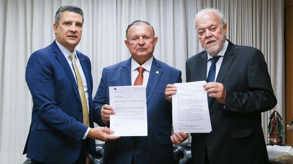 Os presidentes dos Tribunais de Contas do Estado e dos Municípios, respectivamente conselheiros Marcus Presídio e Francisco de Souza Andrade Netto, visitaram na manhã desta terça-feira (21) o presidente da Assembleia, deputado Adolfo Menezes, quando entregam os dois projetos de lei que estabelecem percentual de revisão geral anual incidente sobre ...