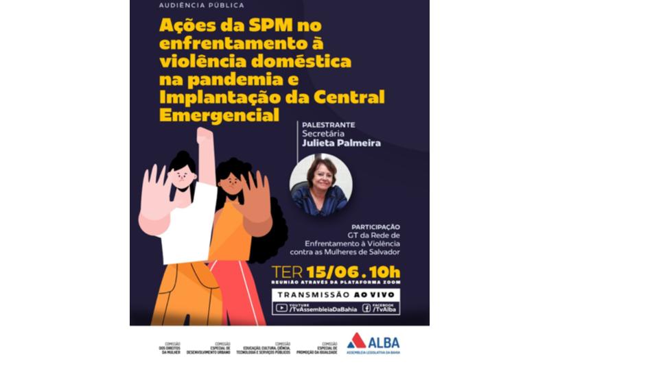 Ações da Secretaria estadual de Políticas para Mulheres (SPM) no Enfrentamento à Violência Doméstica durante a Pandemia e a implantação da Central Emergencial de Atenção às Mulheres serão apresentadas virtualmente em audiência pública, nesta terça-feira (15), às 10h, com palestra da secretária da SPM, Julieta Palmeira, e participação do GT ...