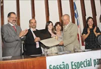 'É com grande alegria que esta casa de leis entrega este título a Haroldo Lima. A AL está fazendo justiça. Como presidente desta Casa, estou vivendo um momento histórico. Tenho certeza que hoje estamos vivendo uma verdadeira democracia graças a homens como este. Homens que lutaram em momentos difíceis, homens que tiveram a coragem de lutar a favor de ideais mais humanitários', frisou Marcelo Nilo.