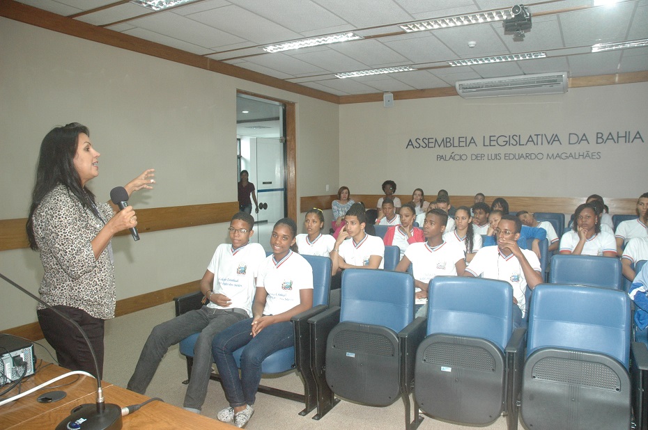 A Assembleia Legislativa recebeu na última quinta-feira a visita de mais uma instituição. Através do Programa A Escola e o Legislativo, mais de 30 alunos do 2º ano do ensino Médio da Escola Estadual Dr. João Pedro Santos, na Av. Bonocô, conheceram a estrutura física e administrativa da Casa. A professora de Historia, Noemi Magalhães, acompanhada da estagiária Norma Silva, também estiveram presentes. “Está sendo muito bom para eles essa visita, por ser um ano de eleição. Eles aprendem sobre os candidatos, onde eles trabalham e também acabam influenciando em casa”, disse Noemi.