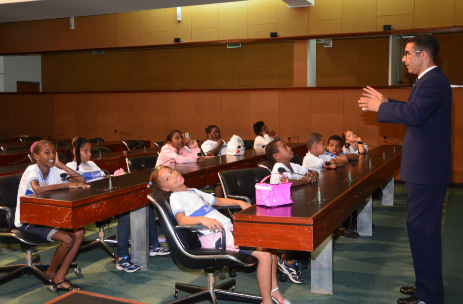 Acolhidos pela coordenadora do programa, Cynthia Rabello, os visitantes foram acomodados no plenarinho. O grupo de visitantes era composto por 15 alunos do 3° ano do ensino fundamental, 2 professores, 1 auxiliar de turma e a mãe de um dos alunos. Essa é a primeira vez que a Escola Municipal São Gonçalo do Retiro visita a AL.