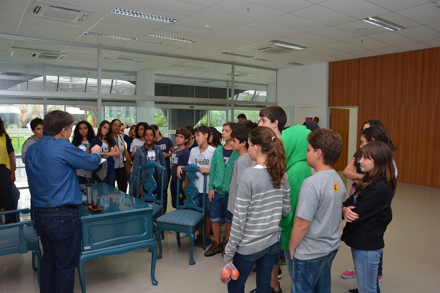 Acolhidos pela coordenadora do programa, Cynthia Rabello, os visitantes foram acomodados no plenarinho. O grupo de visitantes era composto por um professor, 2 auxiliares e 34 alunos do 7° ano do ensino fundamental. Essa é a quarta vez que o Colégio Oficina visita a AL.