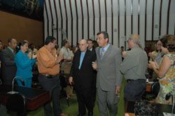 Sob aplausos de numerosa platéia, Targino Machado conduz o monsenhor Hermenegildo de Castorano para o início da sessão especial