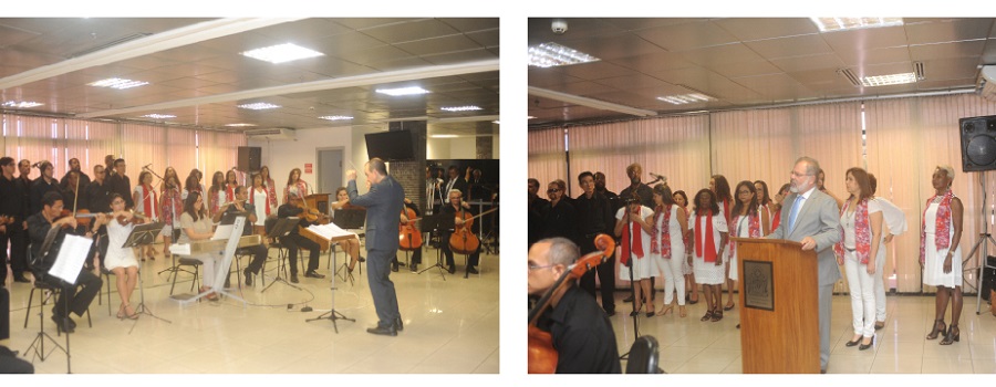 Ao som do Coral do Legislativo, servidores e colaboradores da Assembleia Legislativa da Bahia participaram da confraternização natalina realizada ontem no saguão Nestor Duarte. A confraternização é uma realização conjunta entre a Escola do Legislativo e a Superintendência de Recursos Humanos. Sob a regência do maestro Cicero Almeida, os presentes assistiram a um concerto com músicas tradicionais de Natal, canções brasileiras e africanas, que em suas letras reforçavam o sentimento de união, amor ao próximo e prosperidade.
