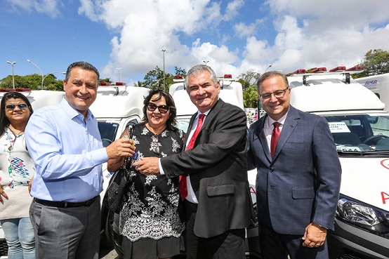 Com um investimento do Governo do Estado da ordem de R$ 6,1 milhões – oriundos de emendas impositivas dos deputados estaduais -, o governador Rui Costa (PT) fez a entrega, na manhã desta quarta-feira (15), no estacionamento da Governadoria, de 78 ambulâncias para prefeituras baianas. As chaves foram entregues a cada chefe do Executivo municipal, acompanhado do deputado estadual que fez a respectiva emenda – respeitando a ordem alfabética do nome dos municípios.