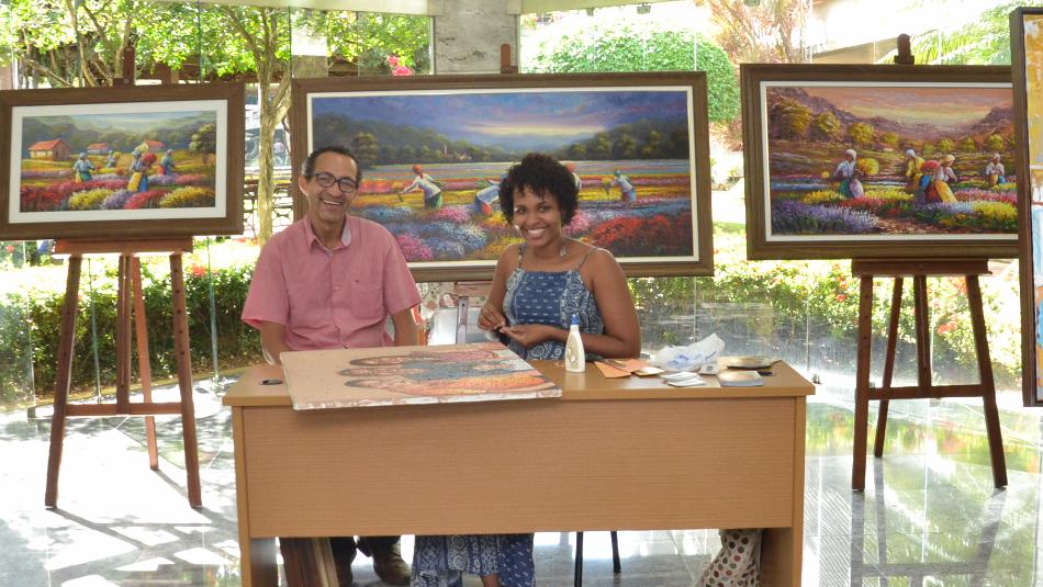 Já a engenheira de produção e artista plástica autodidata Rafaela Anjos relata que desenvolveu a técnica de pintura e mosaico em papel desde criança e foi em 2009 que ela começou a produzir seus quadros para exposições. “Meu trabalho é todo inspirado na figura negra e na Bahia. É muito bom poder desenvolver junto a Fernando um trabalho que possamos colaborativamente partilhar”, contou a artista.