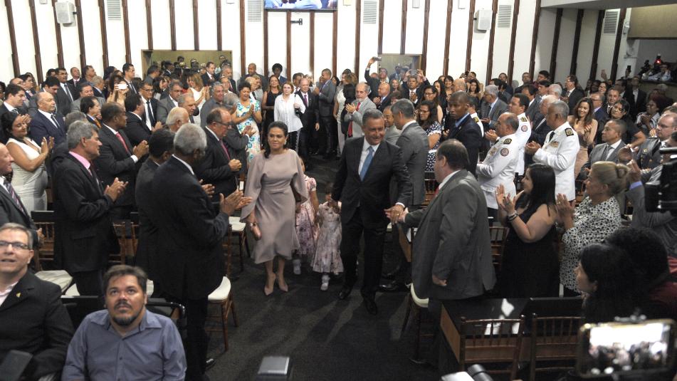 O chefe do Legislativo convidou uma comissão suprapartidária para conduzir Rui Costa e João Leão ao plenário da ALBA. Integraram o grupo as deputadas Fabíola Mansur (PSB) e Maria del Carmen (PC do B), e os deputados Nelson Leal (PP) e Marcelino Galo (PT). O governador reeleito adentrou ao espaço da cerimônia acompanhado da esposa e primeira-dama do Estado, Aline Peixoto, e das filhas menores Marina e Malu. O vice-governador João Leão, por sua vez, entrou acompanhado da esposa Teresa Leão.