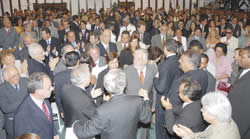 Jaques Wagner foi empossado no governo do Estado pelo presidente da Assembléia Legislativa, deputado Clóvis Ferraz (PFL), às 9h35 de ontem. Foi aplaudido demoradamente – de pé – pelas 500 pessoas que lotaram o plenário. Proclamada a posse, o protocolo da "sessão especial e solene" foi quebrado, com o nome de Wagner entoado em coro pelos presentes. Ele agradeceu com o punho fechado no ar.