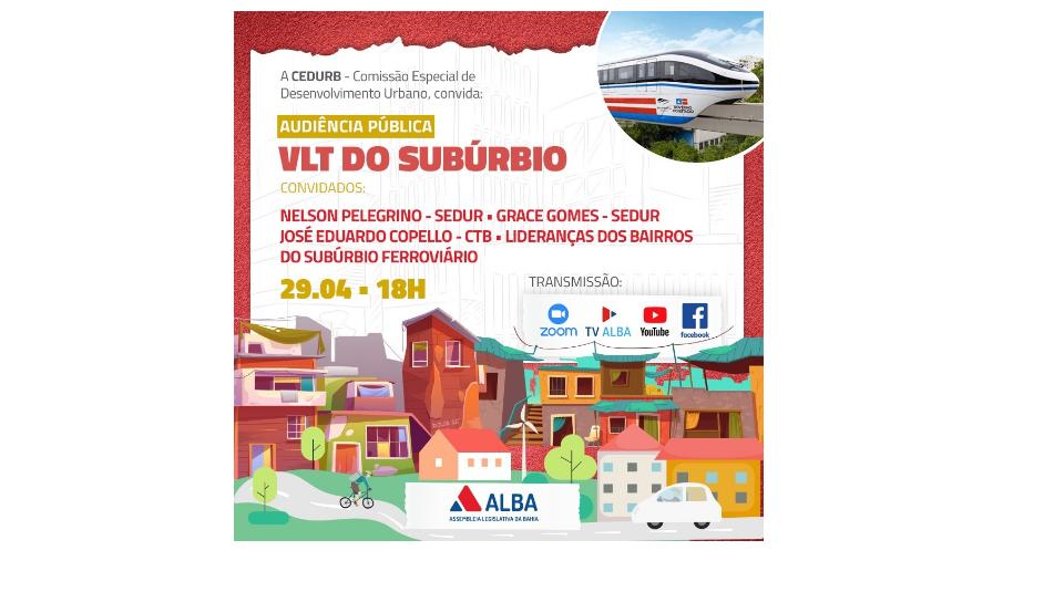 A Comissão de Desenvolvimento Urbano da Assembleia Legislativa (ALBA), presidida pela deputada Maria del Carmen (PT), realiza nesta quinta-feira, dia 29, às 18h, uma audiência pública de forma virtual que discutirá o VLT do Subúrbio.