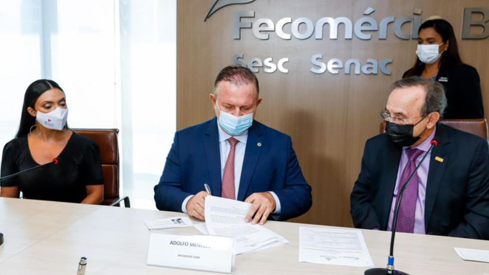 A Assembleia Legislativa da Bahia (ALBA), por intermédio da TV ALBA, assinou convênio de cooperação técnica com a Federação do Comércio do Estado da Bahia (Fecomércio/BA) e seus braços sócio educacionais (Sesc – Serviço Social do Comércio e Senac – Serviço Nacional de Aprendizagem Comercial). O ato, realizado na Casa do Comércio, contou com as presenças do presidente da Assembleia, deputado Adolfo Menezes, da diretora-geral da Fundação Paulo Jackson, Michele Gramacho, e do presidente da Fecomércio/BA, Carlos de Souza Andrade, além de diretores do Sesc e do Senac.