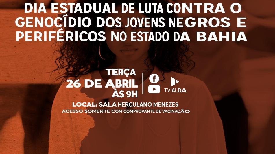 Por iniciativa do deputado Hilton Coelho (Psol), a Assembleia Legislativa realiza, nesta terça-feira (26), às 9h, audiência pública, sobre o “Dia Estadual de Luta Contra o Genocídio dos Jovens Negros e Periféricos no Estado da Bahia”, na Sala Herculano Menezes.