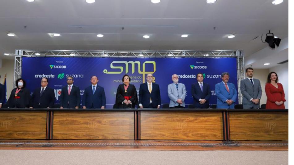 Compuseram ainda a mesa de honra ouvidora do MP, Elna Leite Ávila Rosa, o secretário-geral do MP, Alexandre Soares Cruz, o presidente da secção da Bahia da OAB, Daniela Lima de Andrade Borges, e o presidente da Associação do Ministério Público da Bahia, Adriano Marcus Brito de Assis – além do palestrante, chefe da PGR, Augusto Aras.
