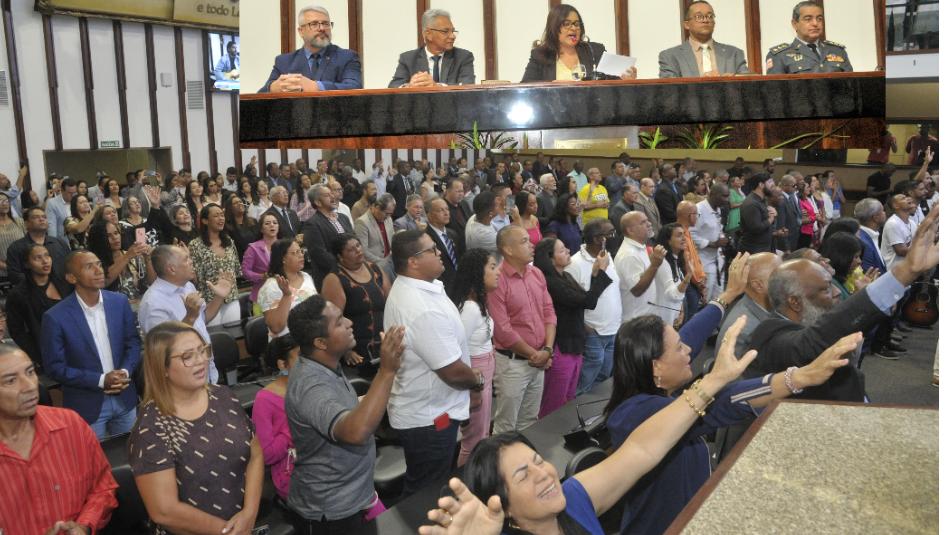 Com o Plenário Orlando Spínola completamente lotado, a proponente da sessão convidou o pastor efetivo da Igreja Presbiteriana de Brotas, reverendo Marcos André, para fazer uma oração inicial, que destacou “a força da Palavra de Deus”. Em seguida, o pastor Miller França, vice-presidente da Sociedade Bíblica do Brasil, Regional Bahia, apresentou o cântico congregacional “Poderoso Deus” e o Coral Proclamação da Associação Batista de Salvador cantou um “Louvor a Deus com Aleluia”. Após a exibição de um vídeo promocional, narrando a trajetória da SBB, o pastor Daniel Costa, presidente da Regional Bahia, falou sobre a importância de comemorar, na Casa das Leis, o Jubileu de Diamante da associação, que tem como missão levar a Palavra do Senhor Deus em todos os lugares. “Nós temos bíblias em presídios, hospitais, casas de repouso, centros de recuperação e nas residências das pessoas. É motivo de alegria, um grande prazer falar sobre a bíblia, uma publicação que contribui para a transformação espiritual e social, uma eterna fonte de conhecimento e educação”, afirmou. O dirigente, em nome da entidade homenageada, fez a doação de uma bíblia em braile para a Biblioteca de Simões Filho, município que é base eleitoral da parlamentar do União Brasil.