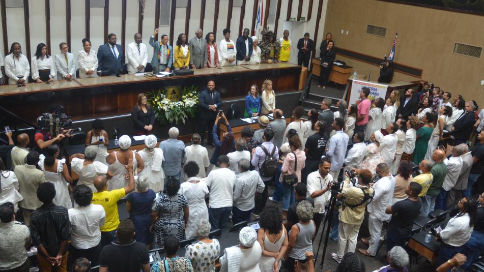 Após a composição da mesa, o ministro Silvio Almeida ingressou, no Plenário Orlando Spinola, acompanhado de mães de santo e de integrantes do Afoxé Filhas de Gandhy, que saudaram o homenageado com o tradicional canto do ijexá. Em seguida, por solicitação do deputado Hilton Coelho, Cacique Babau, falando em nome dos Povos e Comunidades Tradicionais da Aldeia Tupinambá, destacou a luta dos povos indígenas contra a ocupação dos seus territórios.