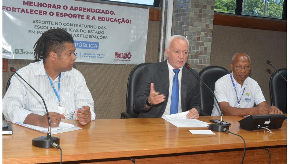A utilização dos equipamentos esportivos escolares no contraturno das aulas na rede estadual de ensino foi discutida na manhã desta quarta-feira (20), durante uma audiência pública promovida pela Comissão de Desporto, Paradesporto e Lazer, da Assembleia Legislativa da Bahia (ALBA). De acordo com o proponente do encontro, deputado Bobô (PC do B), presidente do colegiado, a pertinência da temática se deu em decorrência da construção pelo Governo do Estado de unidades escolares com infraestrutura moderna, equipada com quadras poliesportivas, piscinas semiolímpicas, campos de futebol society e pistas de atletismo.