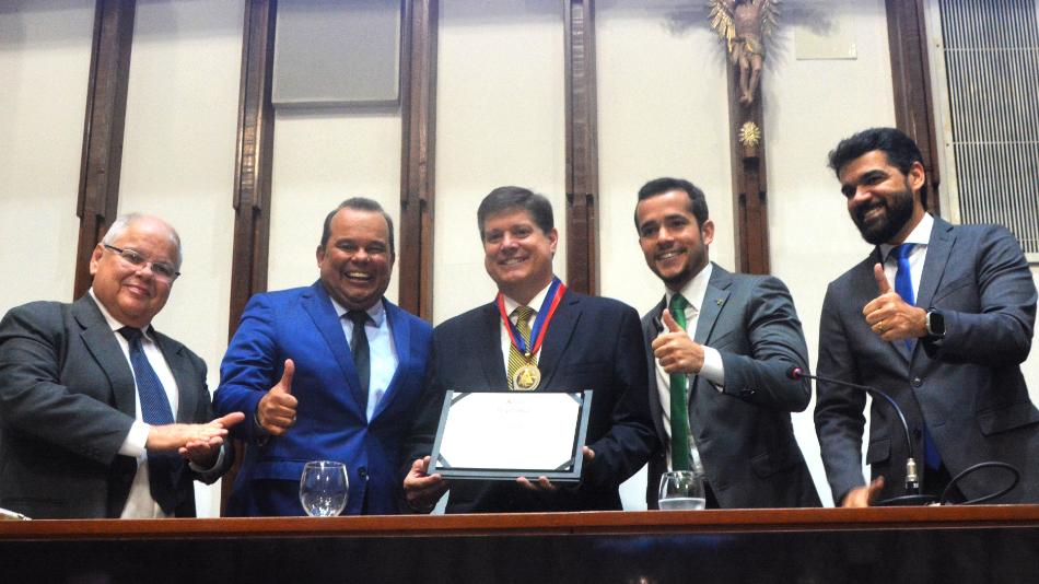 O Plenário Orlando Spínola e as galerias Paulo Jackson ficaram lotados, na tarde desta quinta-feira (16), na sessão especial que outorgou a Comenda 2 de Julho ao presidente nacional do Movimento Democrático Brasileiro (MDB), o deputado federal Luiz Felipe Baleia Tenuto Rossi (SP). Os principais nomes do partido na Bahia – a exemplo do vice-governador Geraldo Júnior e do presidente de honra do MDB, ex-deputado federal Lúcio Vieira Lima – tiveram assento na mesa e discursaram para homenagear o correligionário paulistano, que recebeu a maior honraria da Casa, proposta pelo deputado Matheus Ferreira (MDB), ao som de grupos culturais jovens, como uma banda de percussão baiana e uma dupla de hip hop.