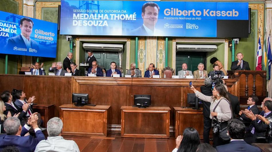 Gilberto Kassab já foi ministro da Ciência, Tecnologia, Inovação e Comunicação, prefeito de São Paulo por duas vezes, além de secretário da Casa Civil do Estado de São Paulo. A outorga da Medalha Thomé de Souza a Kassab foi uma proposta do vereador Edvaldo Brito (PSD). A cerimônia contou com a participação das seguintes autoridades baianas e nacionais: o senador Otto Alencar, presidente do PSD na Bahia; os ministros Alexandre Silveira (Minas e Energia) e André de Paula (Pesca); do vice-governador Geraldo Júnior, do senador Angelo Coronel e do líder do PSD na Câmara de Deputados, Antônio Brito e os deputados estaduais do PSD, Angelo Coronel Filho e Ivana Bastos, Matheus Ferreira (MDB, do PSB, Soane Galvão e Fabíola Mansur , além de outros parlamentares.