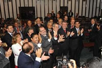 Em clara demonstração do clima harmônico e de entendimento que deve marcar esta Legislatura, na previsão de deputados de diferentes matizes políticos, a eleição da Mesa Diretora da Assembleia se deu em chapa única, definida por acordo de lideranças e segundo o princípio da proporcionalidade da representação partidária. E, para evitar desarmonia e embates políticos em plenário que maculassem a união, três deputados renunciaram às suas candidaturas em regime de articulação.